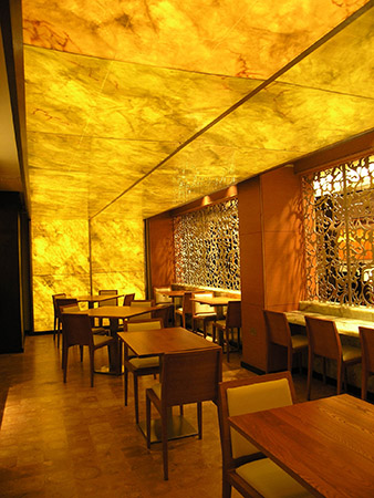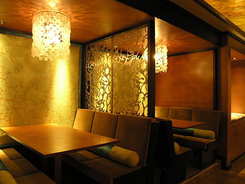 Minimalist wall hangings, softly illuminated glass ceilings, low-backed tables and lounge-booth seating create an intimate oriental space in this 1884 historical building.